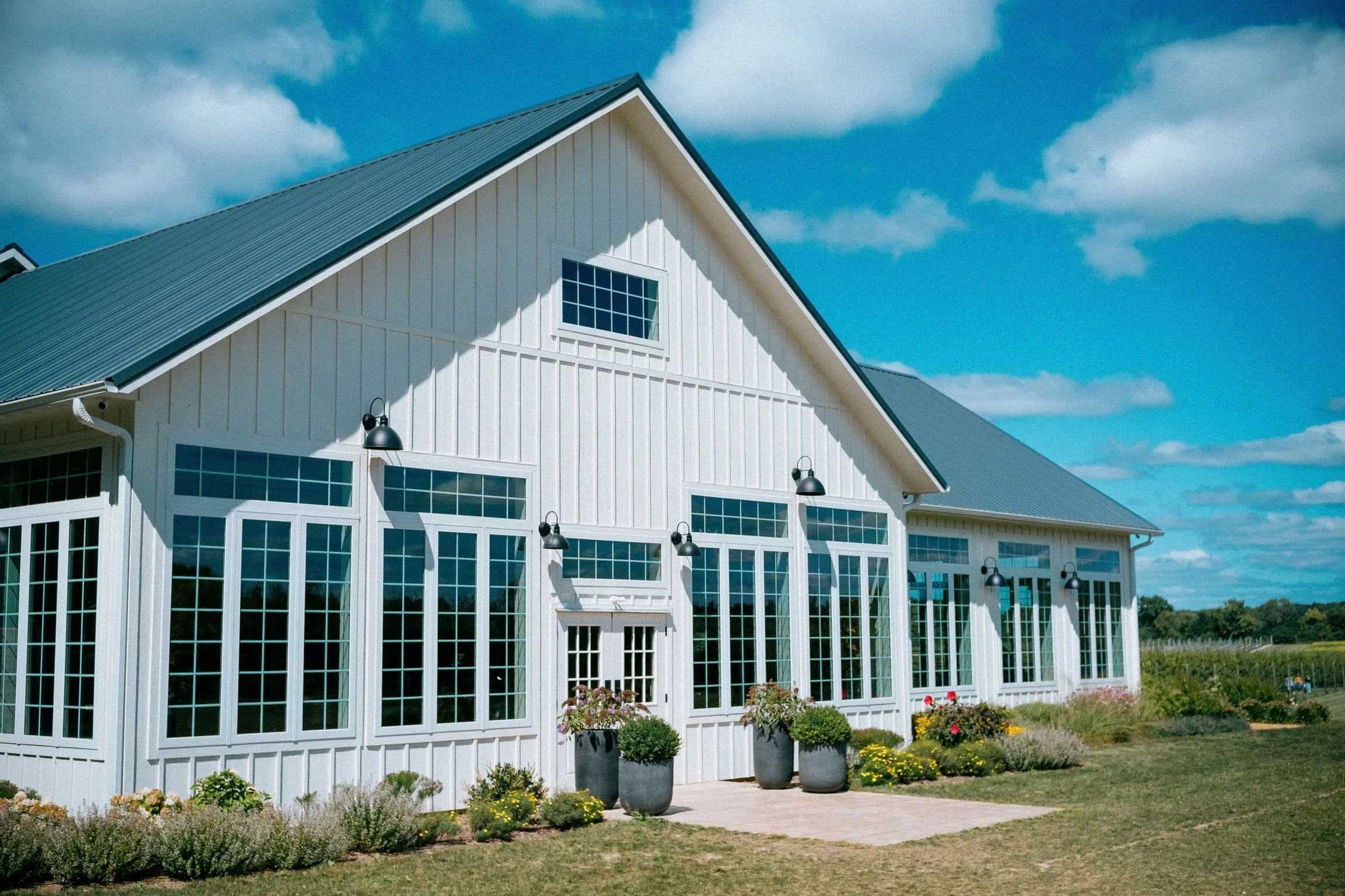 People enjoying an outdoor gathering at picnic tables in front of a large white barn with a gabled roof and multiple windows on a sunny day.